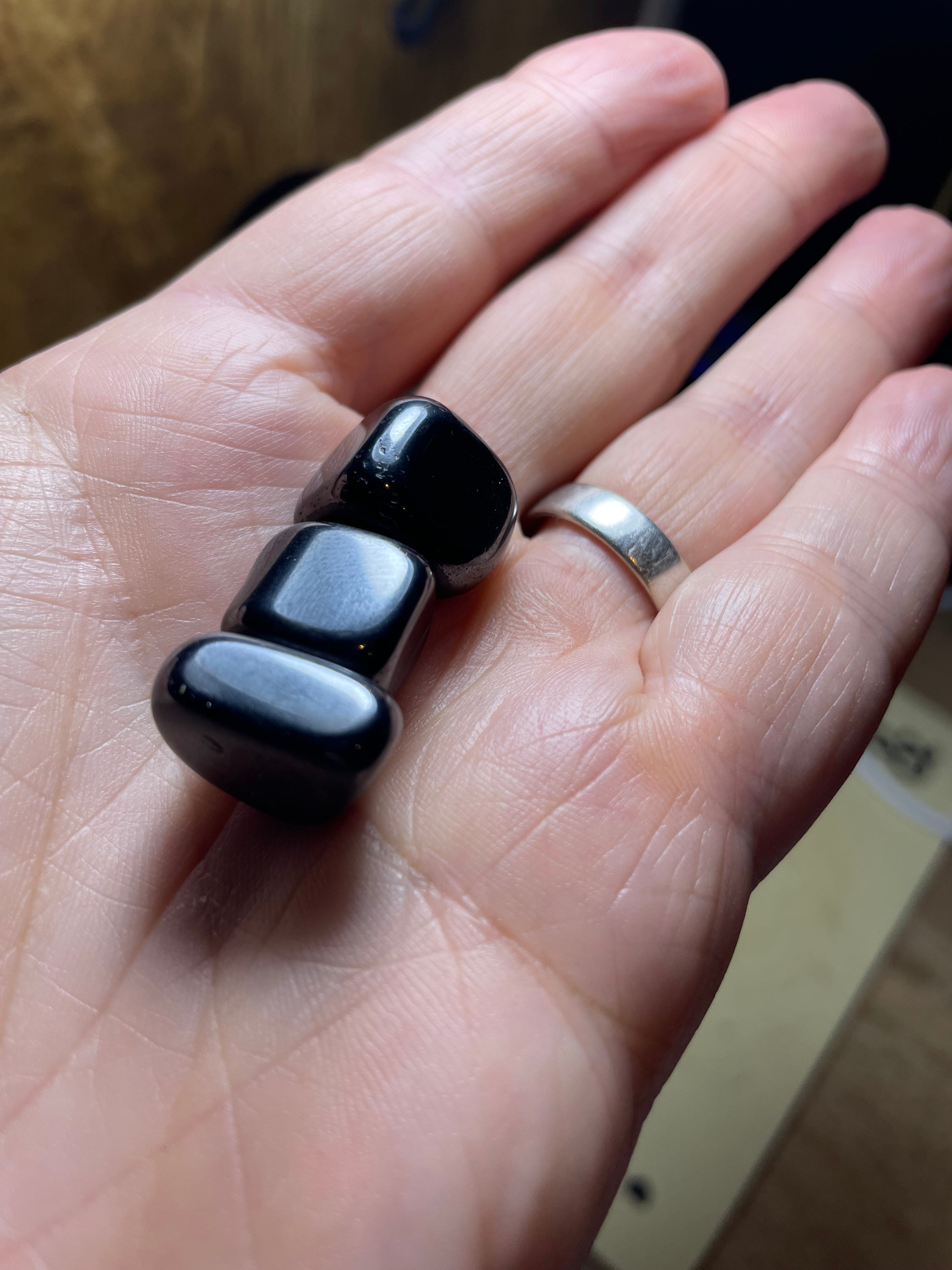 Three of those dark grey magnetic stones are rigidly pointing to attention on the side of my desk lamp today. I pick them up most days when I’m writing. I fiddle when I’m stuck or I’m reading. I move their rounded shapes around in my hand, relying on the magnetism to snap them back together with a dull clang. I’m trying to work a combination, the one which allows the end stone to spin more quickly. Every now and then I do a spin test which means I need both hands.